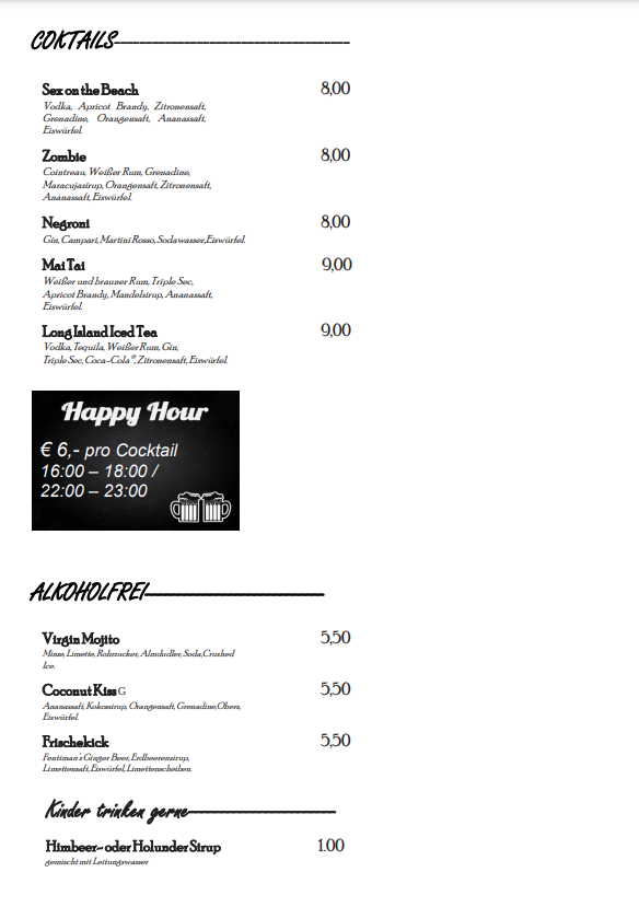 In der Happy Hour von 16.00 - 18.00 Uhr und 22.00 - 23.00 Uhr kosten die Cocktails nur 6.00 €.