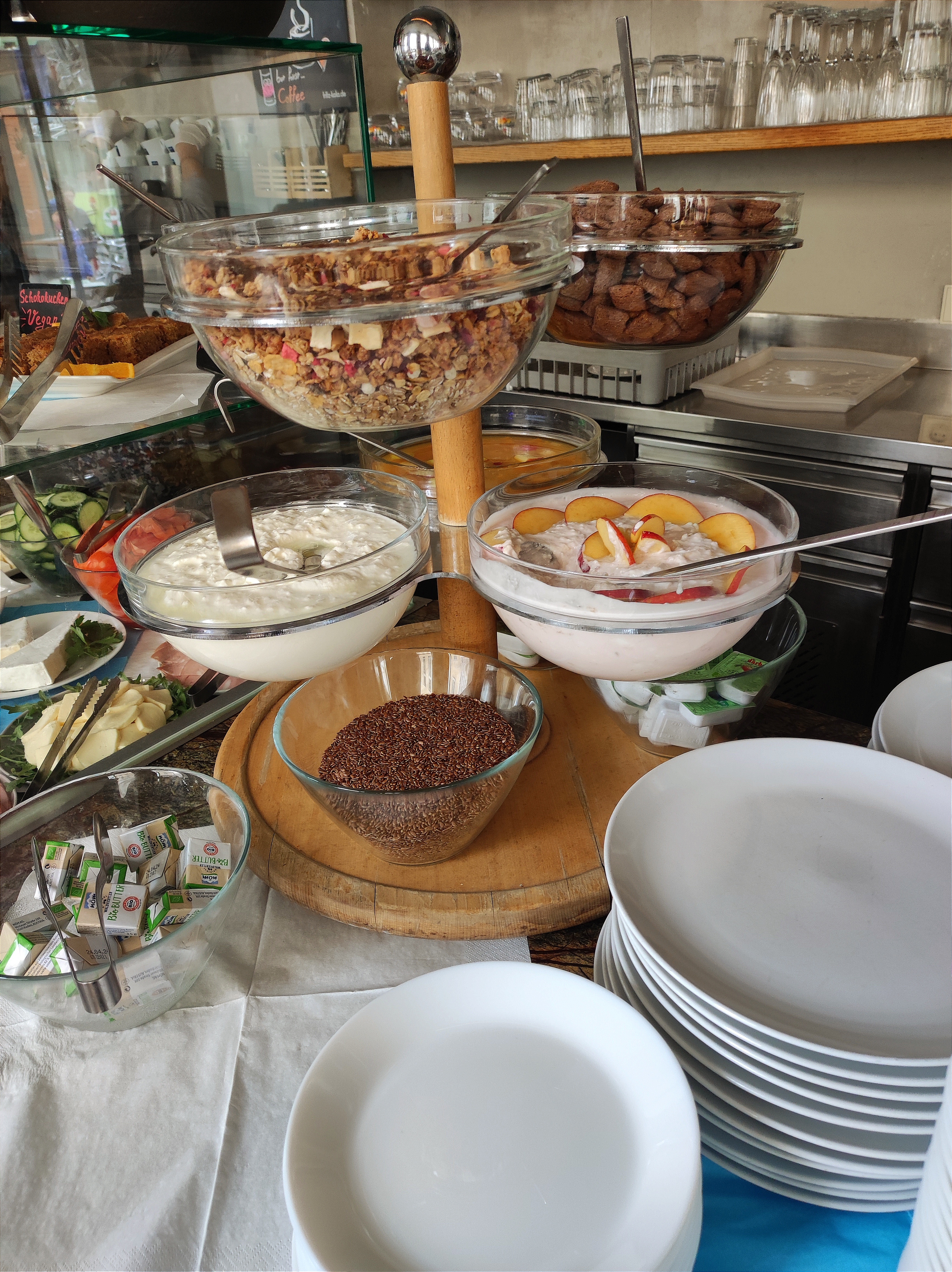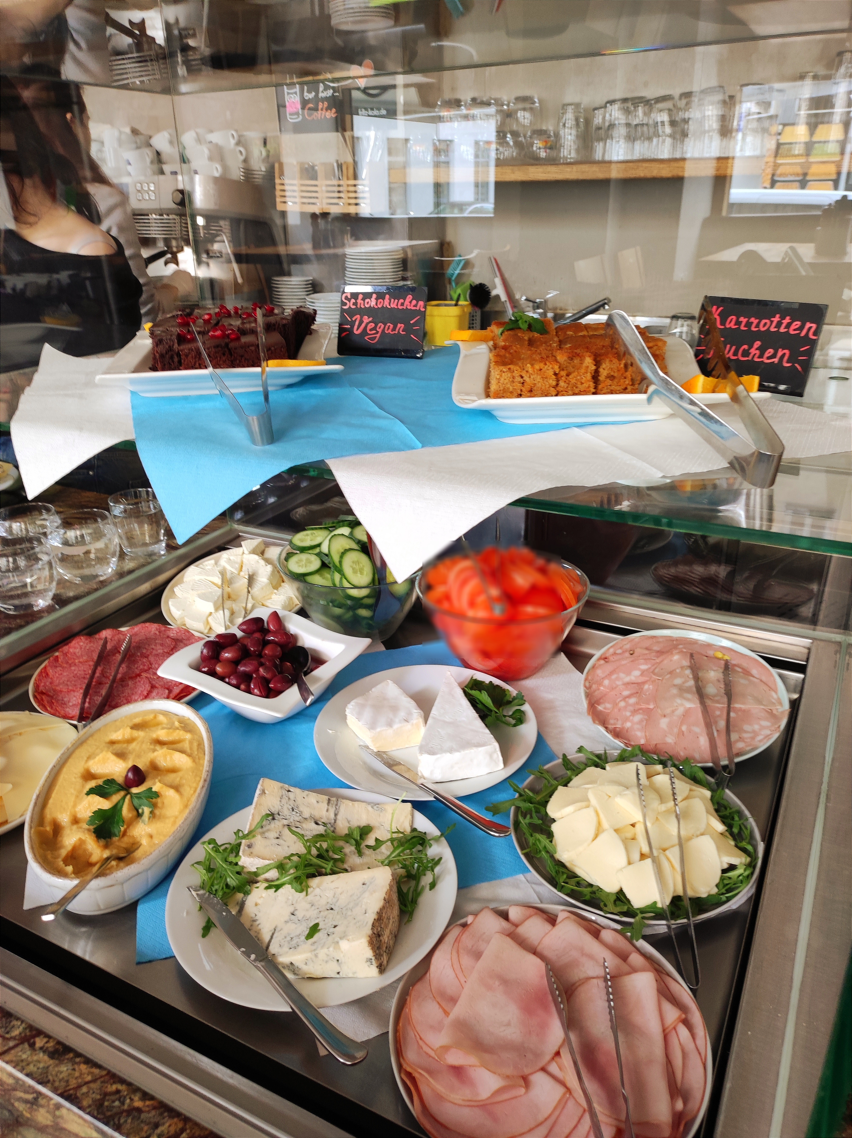 Um 16.00 € erhält man hier eine Auswahl an verschiedenen Kuchen, Käse, Aufstrichen, Wurst, Granola, Porridge und Joghurt.