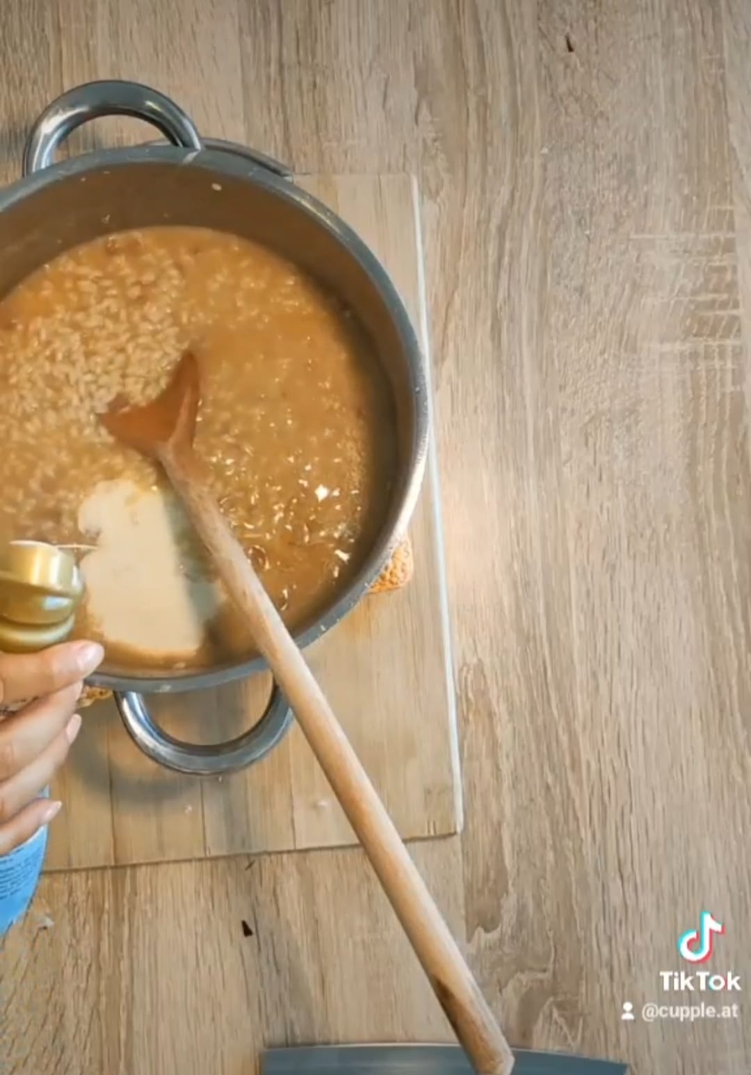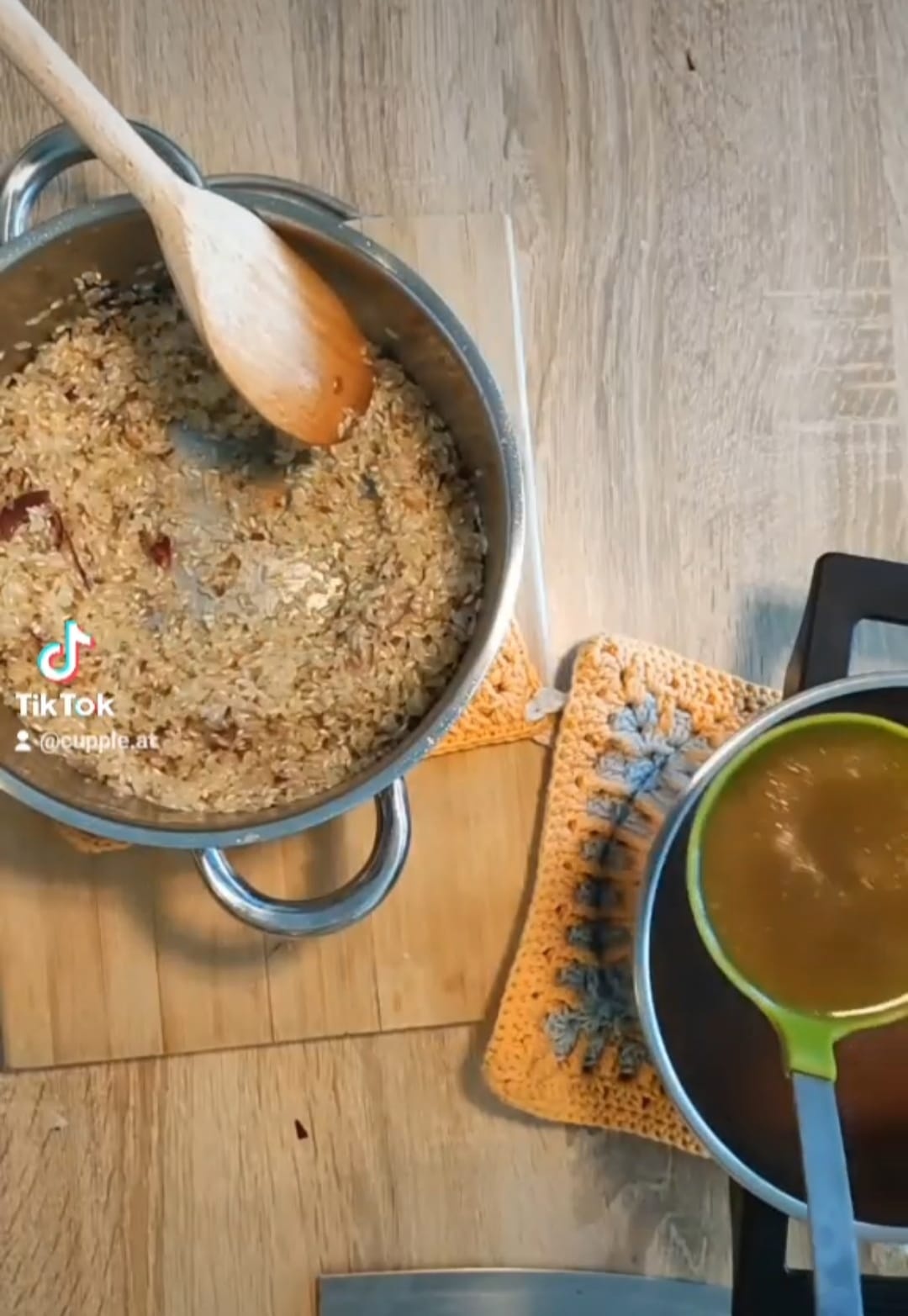 - Wieder paar Schöpflöffel Suppe dazu und den Vorgang so lange wiederholen bis die Suppe leer ist, oder der Reis fast fertig.